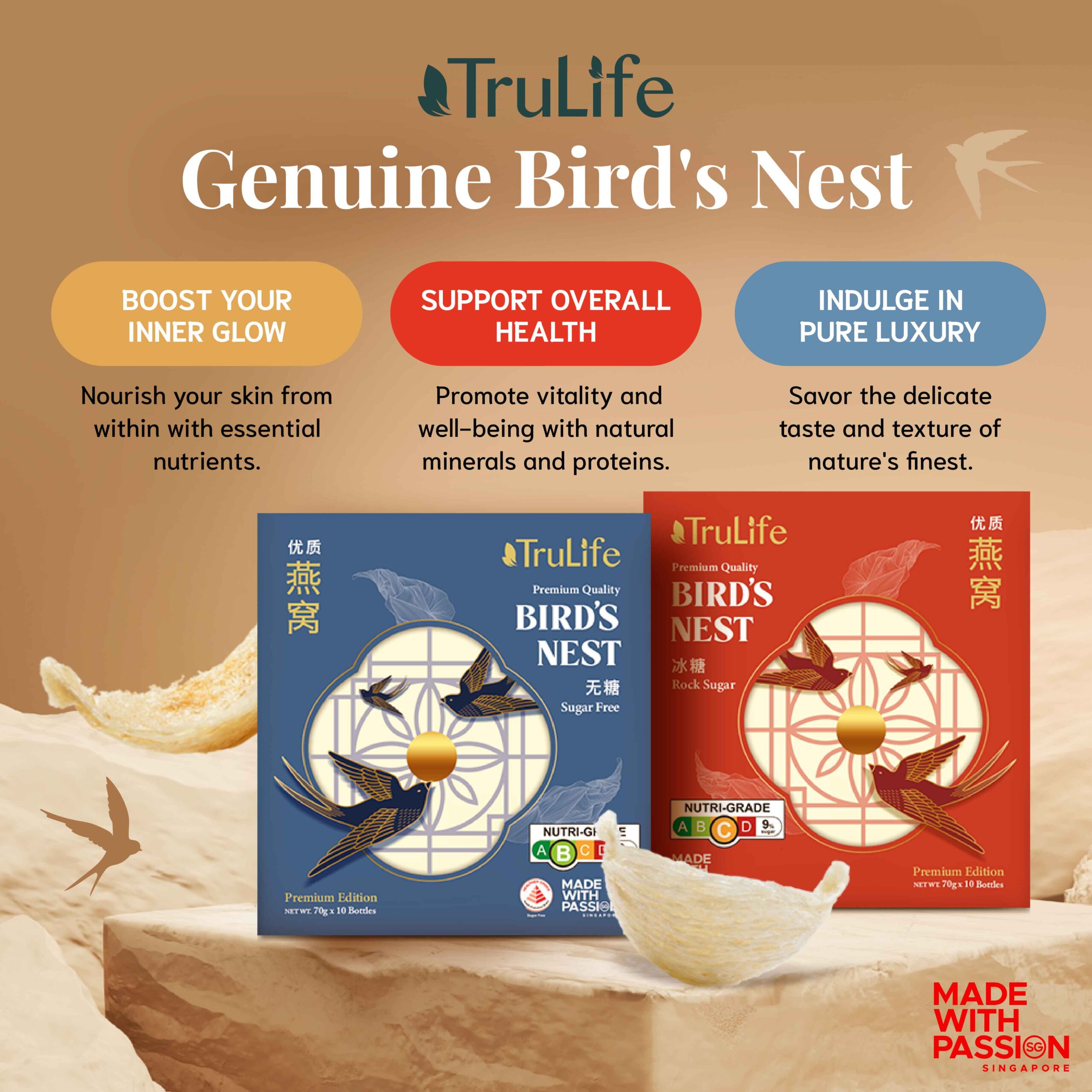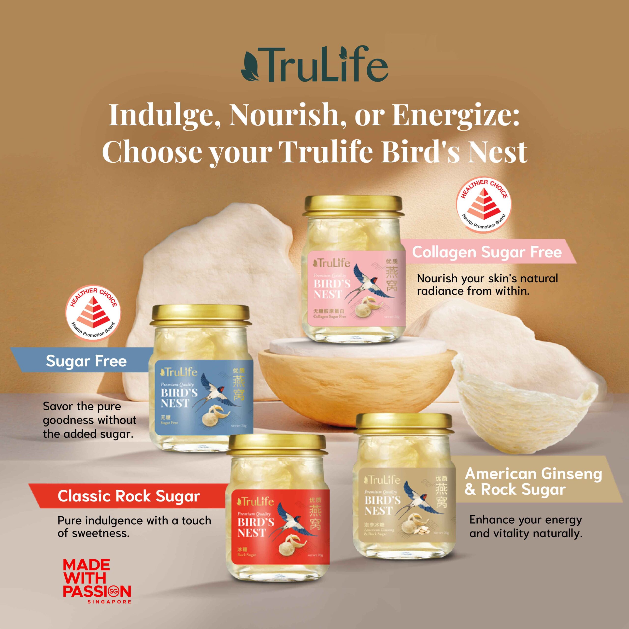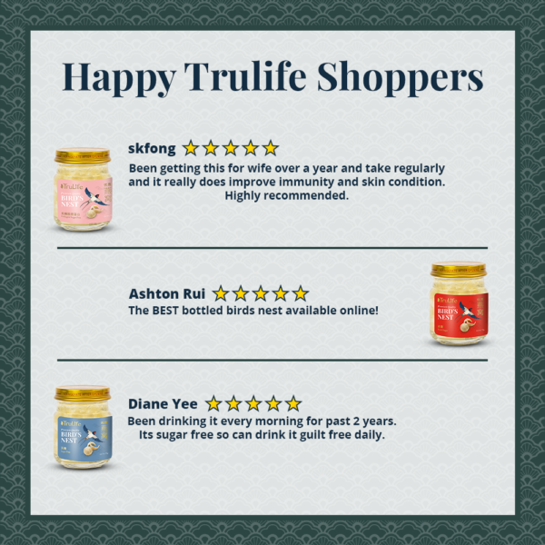 Delight in the TruLife Bird’s Nest Sugar-Free Gift Pack—crafted with 100% pure bird’s nest and absolutely no sugar added. Embrace the natural essence of bird’s nest without compromising your dietary choices. Carefully made in Singapore, offering you a taste of luxury and tradition.