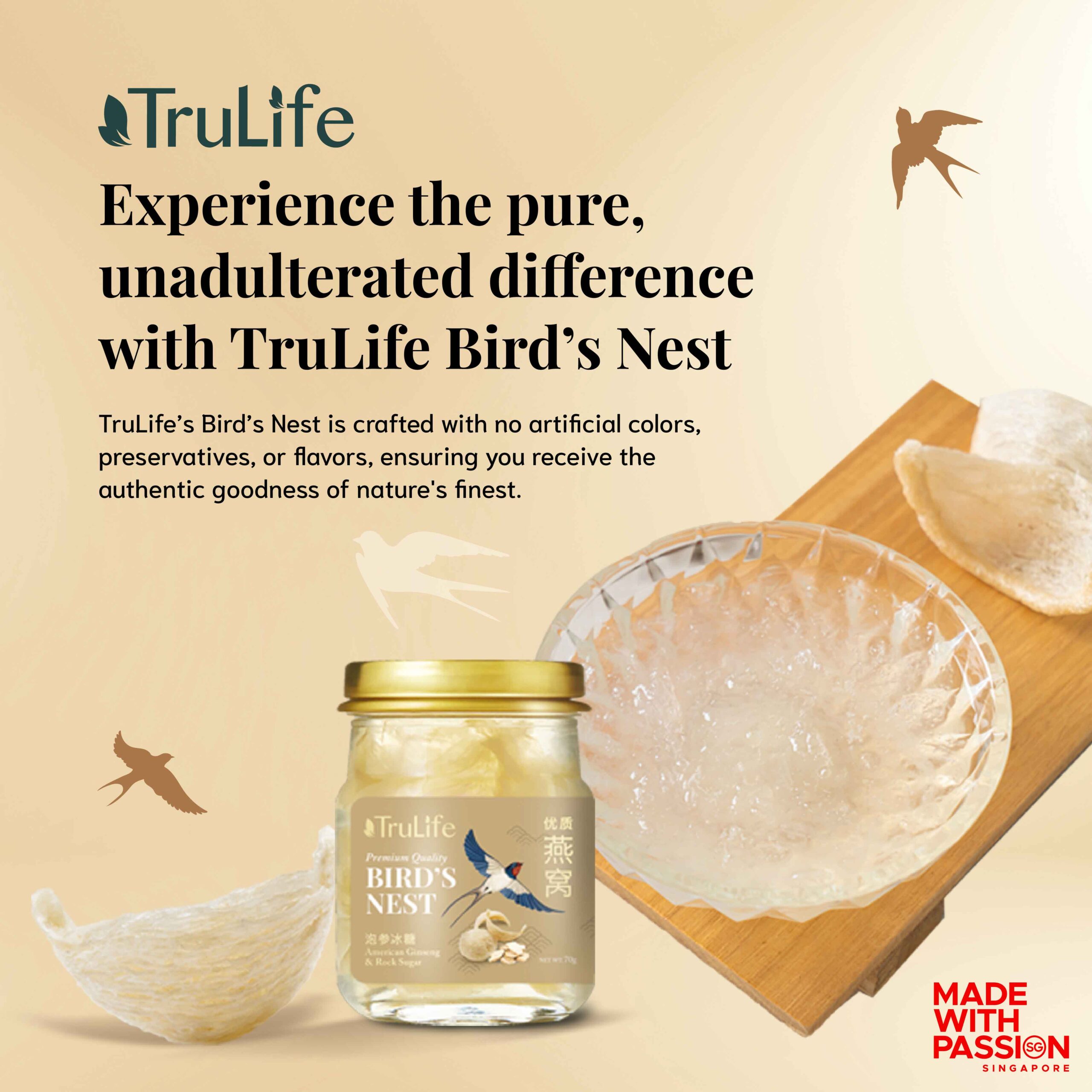 TruLife only uses 100% pure genuine bird’s nest. We do not add replacement ingredients like seaweed and white fungus to our bird’s nest products.